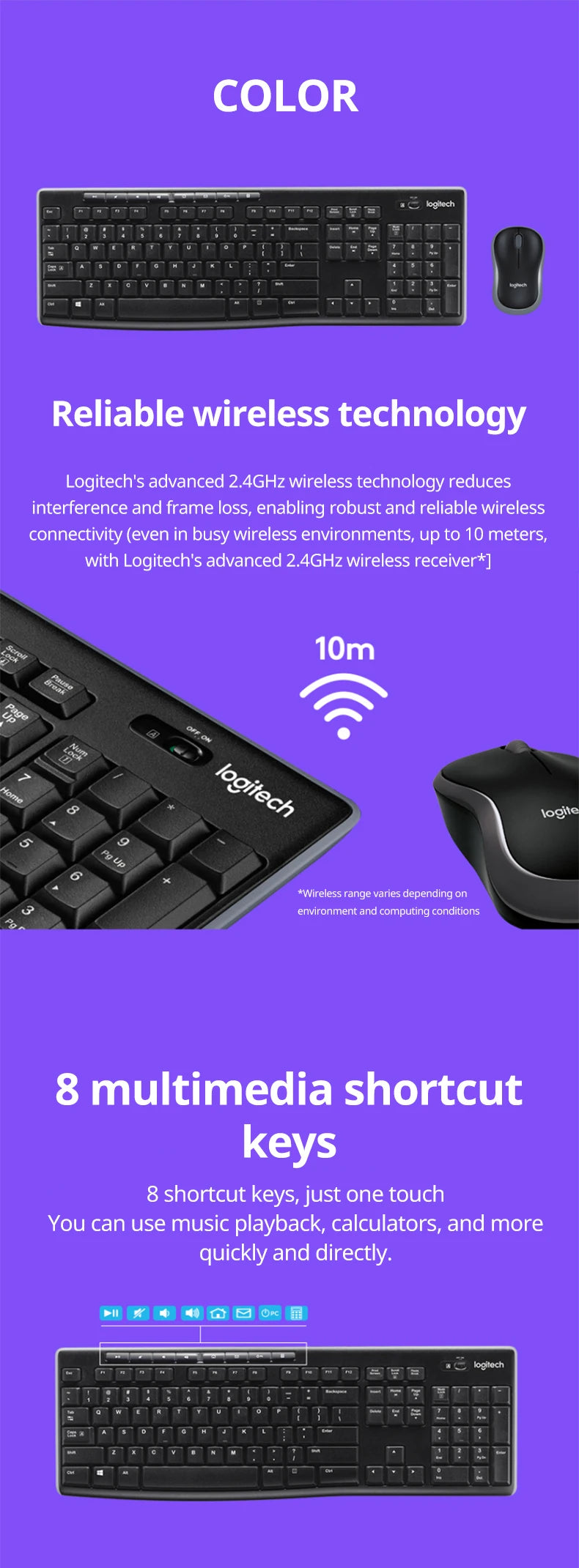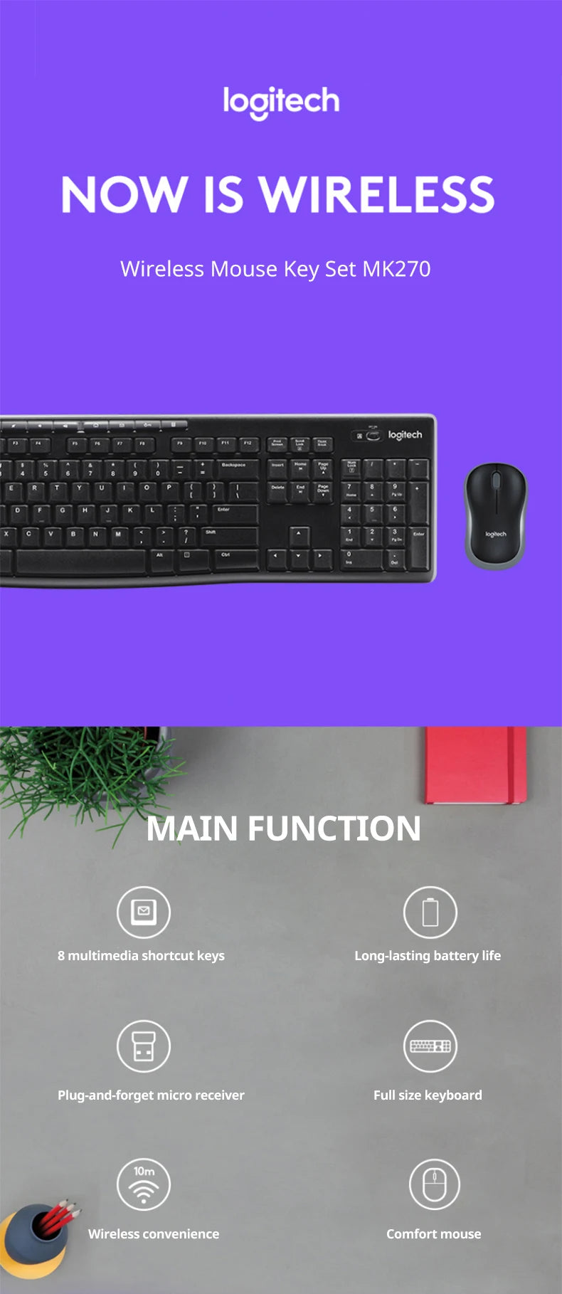 Logitech-mk270 teclado e mouse sem fio para laptop, tamanho completo, com receptor 2.4g